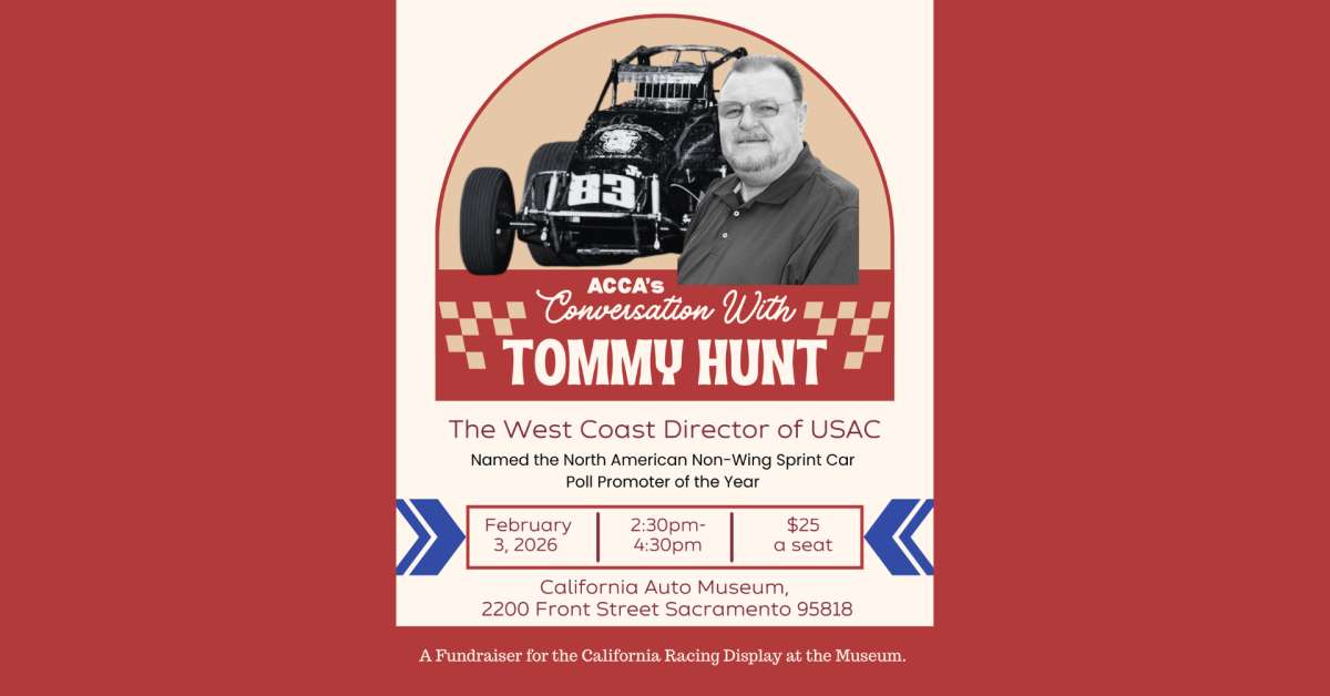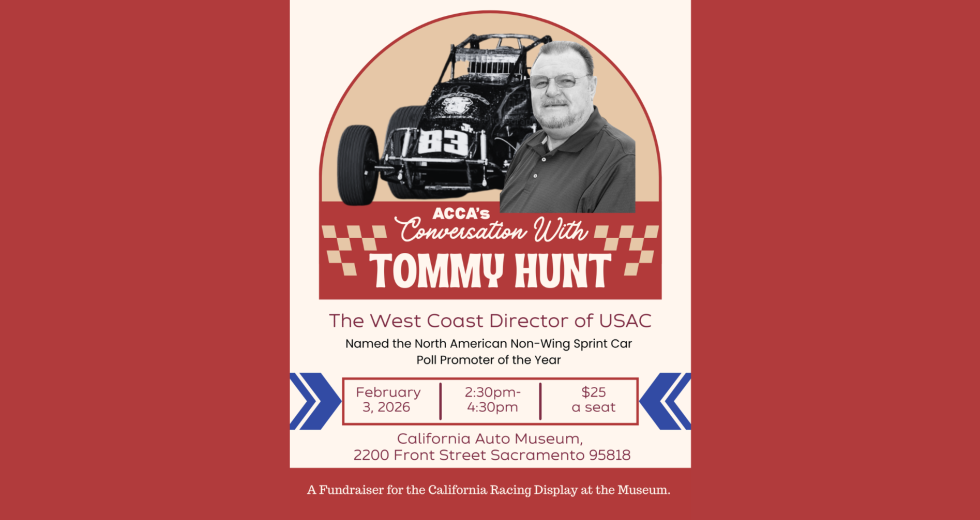 Don’t miss the next installment in our speaker series! On February 3, 2026, Tommy Hunt, named the North American Non-Wing Sprint Car Poll Promoter of the Year, will be at CAM! Enjoy an afternoon of history, stories, and more from 2:30 p.m. to 4:30 p.m. Refreshments will be served. Tickets are $25 while they last. All proceeds benefit the Racing Gallery for the California Automobile Museum!