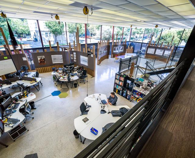 VSP wanted The Shop in Midtown to be flexible, buildable and breakable, a learning space and a prototype in itself (form following function). With that in mind, architects put wheels on the tables and on corrugated cardboard walls to make everything portable and adaptable.