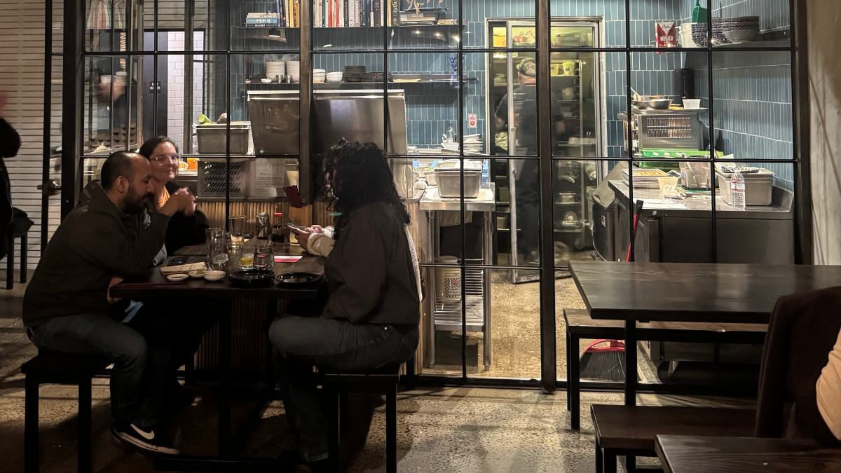 Inside, the room is intentionally restrained. Low lighting gives the space a moody, intimate feel, while a glass-enclosed kitchen anchors the dining area and puts Valente’s work on full display. The footprint is compact, with a tight waiting area near the host stand that fills up with guests waiting for a table.