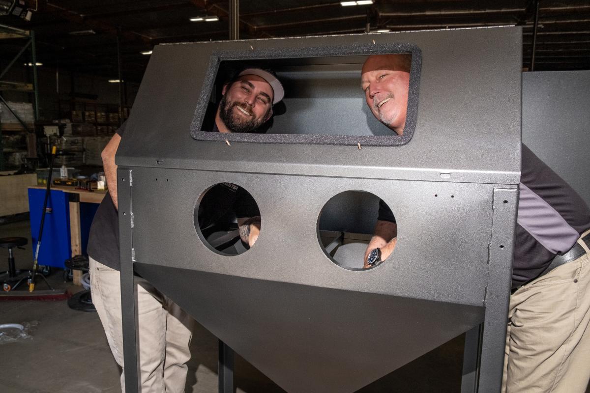 Rick Hayes (right), owner of Raptor Blaster, poses with his son