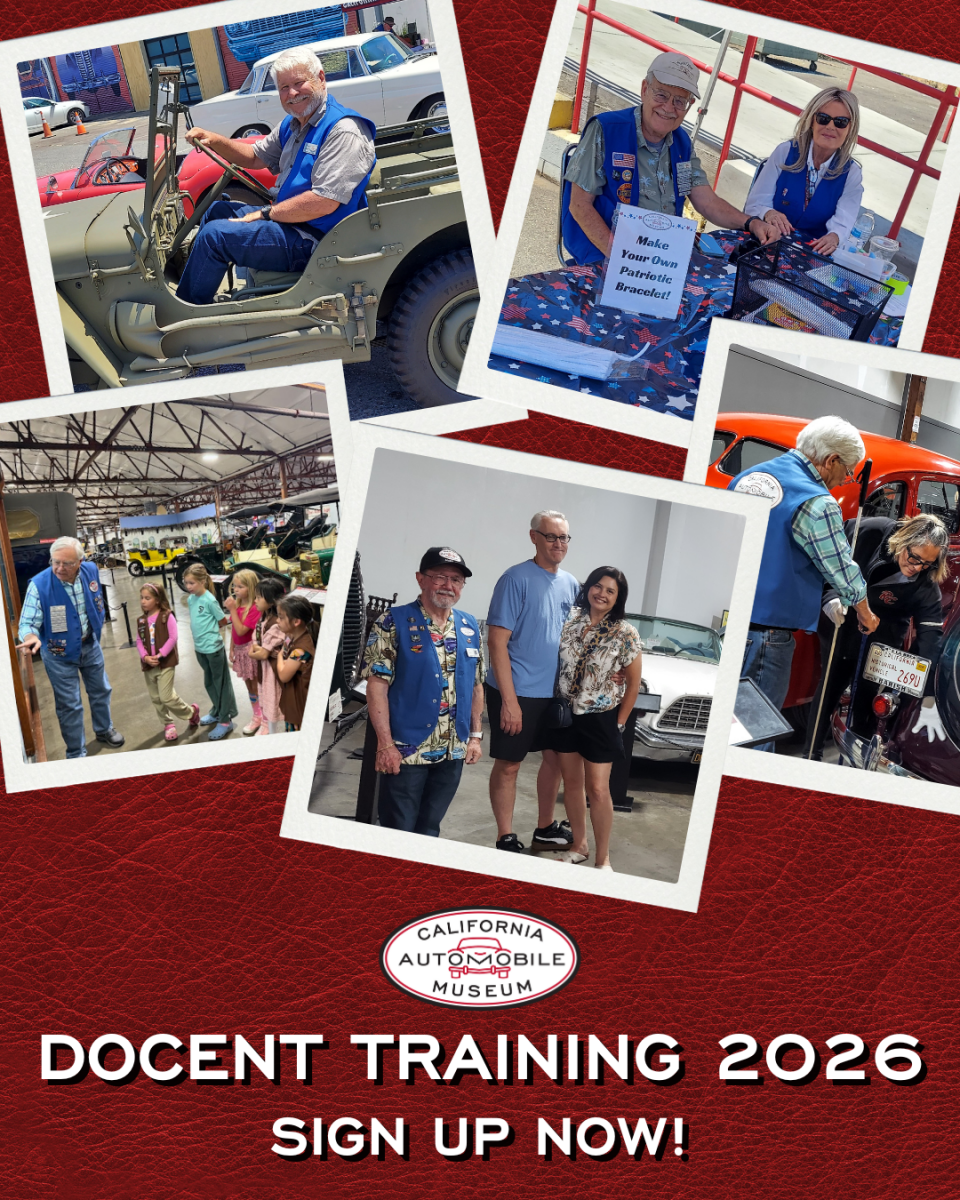 Interested? The next docent class program runs from January through April, and preps you for everything you need to know about being a docent, along with tons of car history. Register at our front desk or online – registration is $50 for museum members, and $99 for nonmembers! Visit calautomuseum.org! Docent training starts on January 7th, 2026.