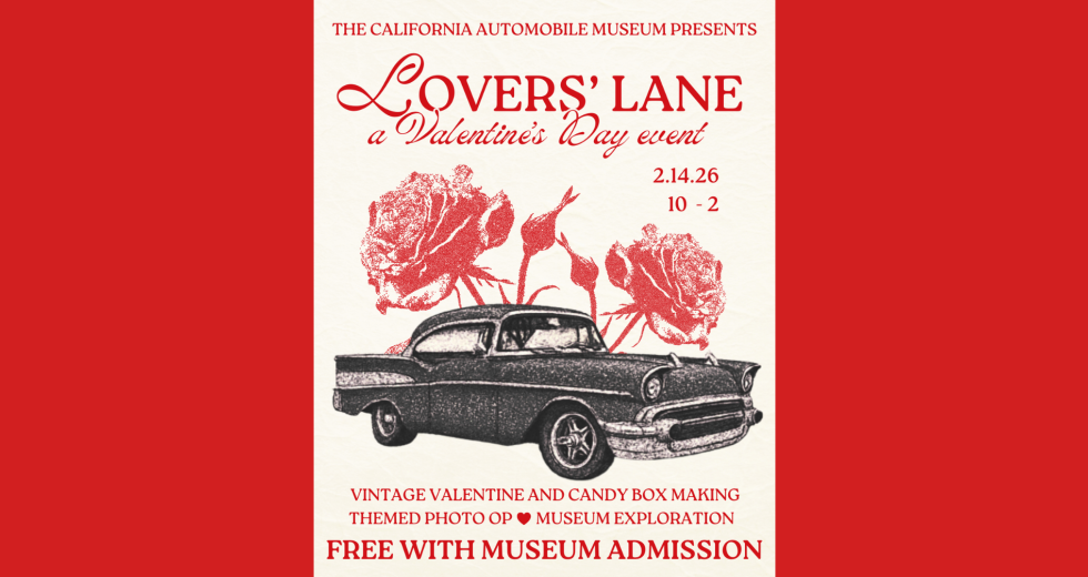 Visit the California Automobile Museum on February 14, 2026, from 10 a.m. to 2 p.m. and join in on our Lovers’ Lane event! Couples and families alike can enjoy our special vintage Valentine’s photo op, create their own vintage valentines, and explore the museum. Guests can even decorate their own candy boxes and fill them with their favorites, all for the low price of $5 per box!