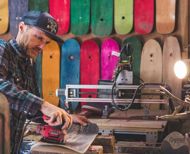Corey Sholes, a self-described skateboard fanatic, was 18 years old when he cut his first skateboard. Eventually, he started pressing his own boards using a vacuum press system, and making handcrafted boards became his full-time job and his business, Legend Skateboards, in 1994.