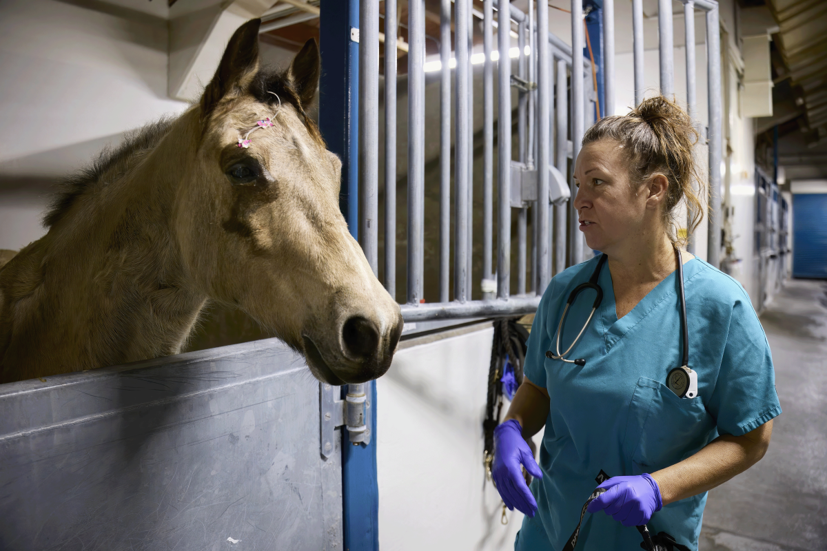 Monica Mason is a large animal technician with UC Davis Emergency Veterinary Hospital in Davis, meaning she works with animals ranging from horses to livestock and even a zebra. The hospital can provide simple farrier (hoof) care to the most complex of surgeries for large animals. The mother of two children, ages 6 and 15, Mason likes the overnight shift because it gives her more time for them during the day. She likes the quiet and less busyness of the overnight.