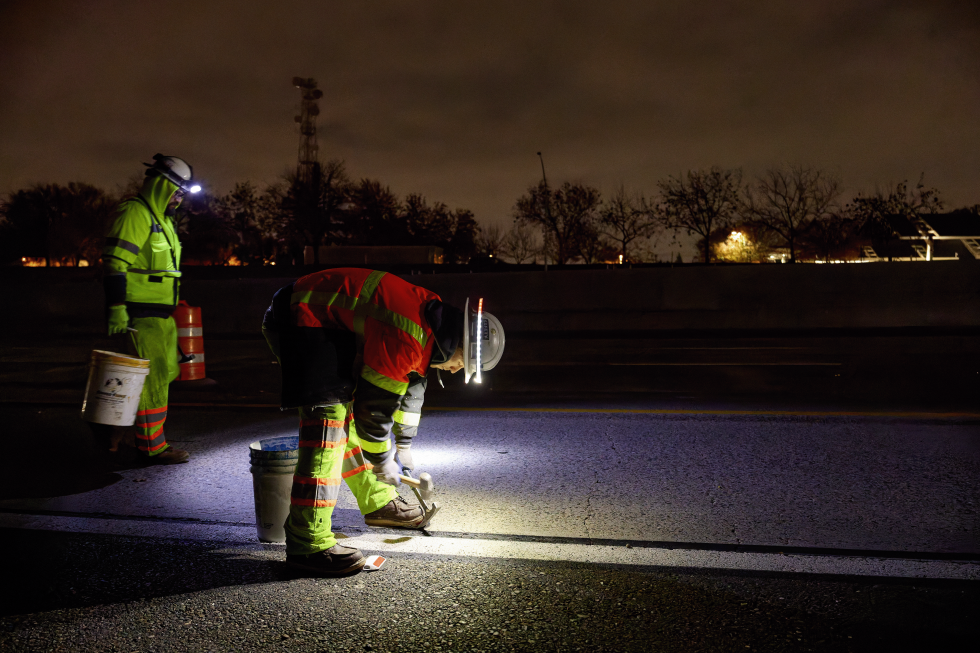 Pena likes his work, knowing that the nighttime hours are the only times his crew can do repairs when traffic is reduced. He’s been doing roadwork for 25 years and finds it satisfying to see the progress of a project.