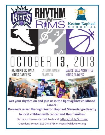 Join the Keaton Raphael Memorial team for another great partnership event with the Sacramento Kings Foundation and Rhythm & Rims 5K Walk and Entertainment! Get your rhythm on and join us in the fight against childhood cancer on October 13th! Proceeds raised through Keaton Raphael Memorial go directly to local children with cancer and their families. It’s set to be a morning filled with music in downtown Sacramento. After the walk, enjoy entertainment, interactive booths, kids activities, more music, food and fun! Keaton Raphael Memorial team will have the traditional cake walk once again so be sure to stop by and walk your way to a delicious treat! The more you raise the more rewards including tickets to Kings games and even an opportunity to get right into the VIP reception where you’ll meet our very own Sacramento Kings Players and Rhythm ‘N Rims sponsors!