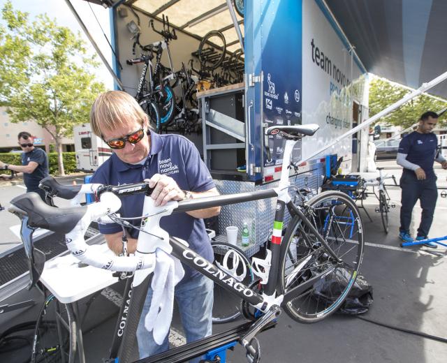 Andy Stone, head mechanic for Team Novo Nordisk, prepares a bike during training camp for the Amgen Tour of California’s Sacramento stage in May. A Sacramento native, Stone attended Encina High School where he took a Regional Occupation Program bicycle mechanic class. He worked at bike shops for several years before getting into race mechanics.