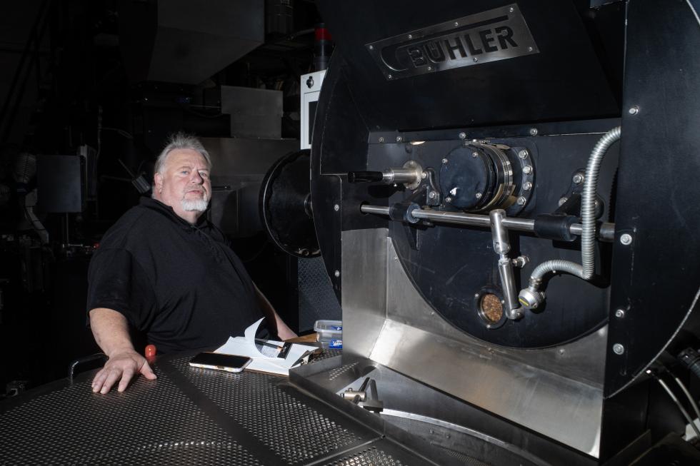 Fabrice Moschetti poses with one of his roasting machines in