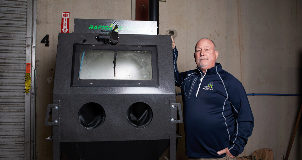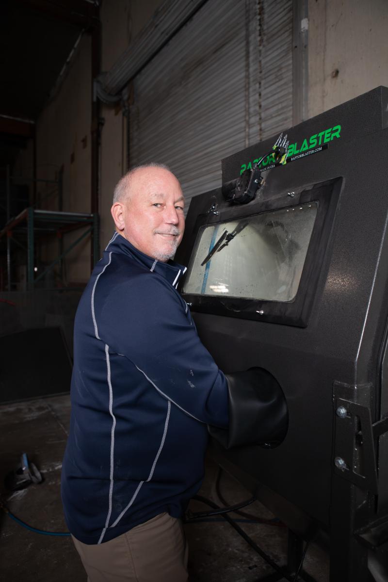 Rick Hayes demonstrates the operation of one of his sandblasting