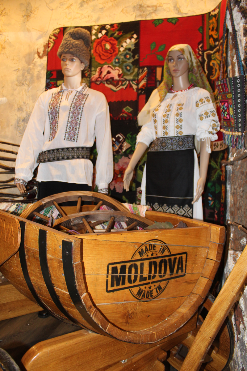 Two mannequins dressed in traditional Moldovan clothes are on